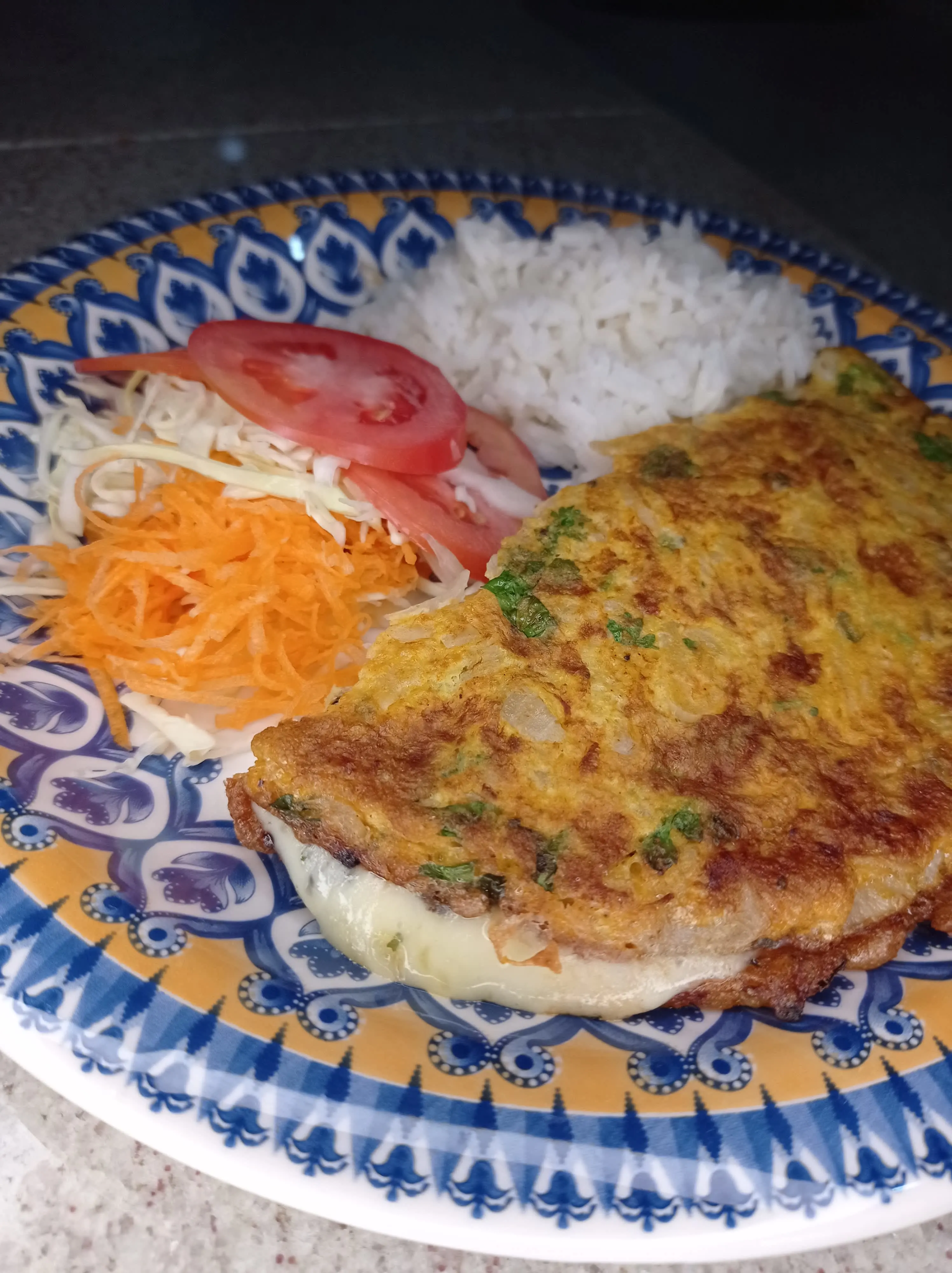 Omelete de presunto e queijo acompanha arroz, feijão,salada e pastelzinho de queijo