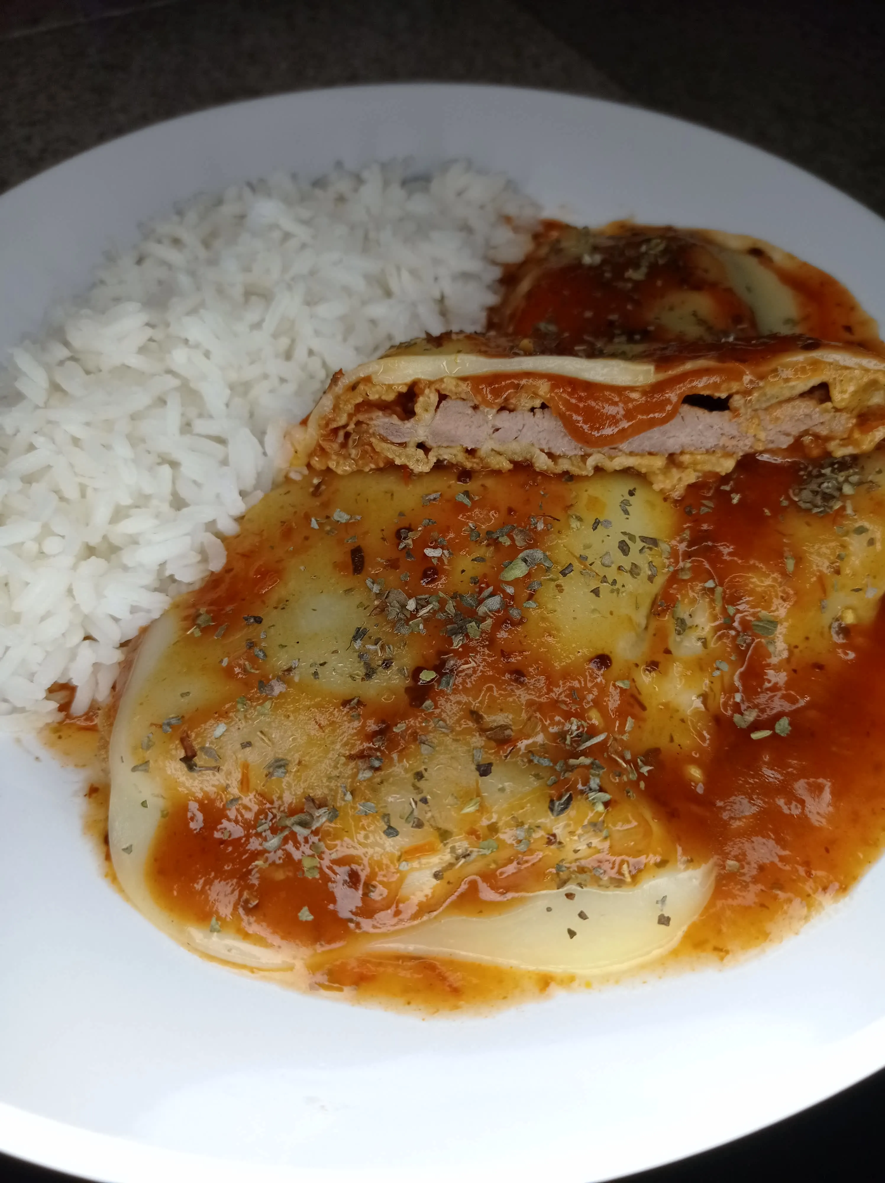 Filé de frango a Parmegiana acompanha arroz, feijão, salada e pastelzinho de queijo