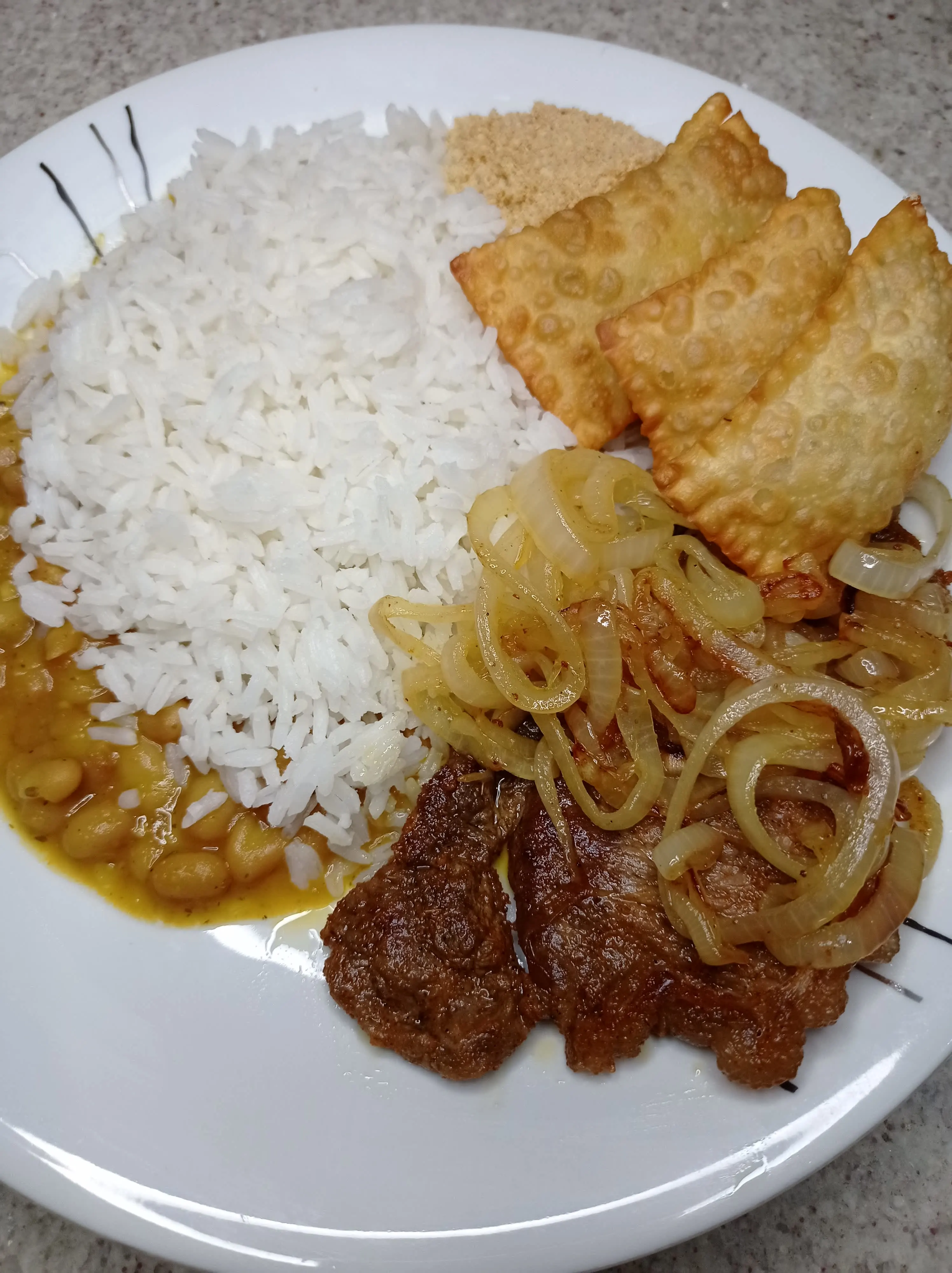Contra filé Acebolado acompanha arroz, feijão,farofa,salada e pastelzinho de queijo